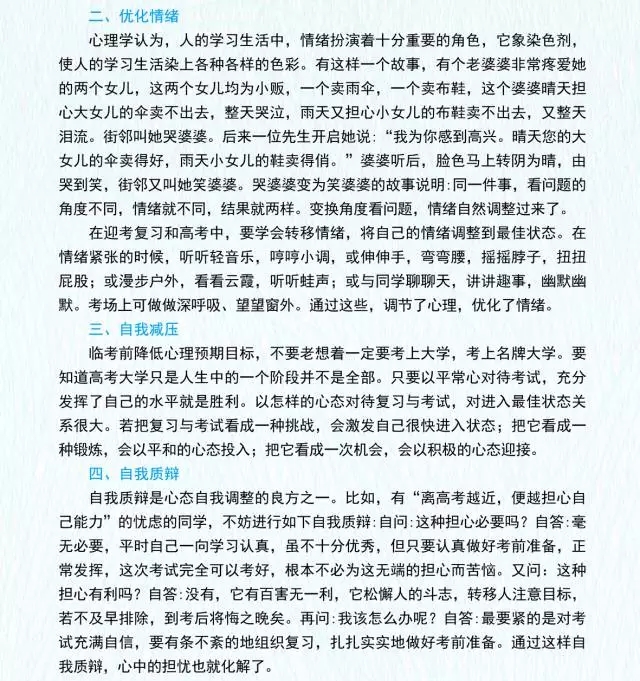 另一方面,家長也要注意避免詢問考生“考得怎么樣”等與考試相關(guān)的話題。上午或者下午考試結(jié)束后,考生不要劇烈運動,有可能的話洗個澡放松,保持適當(dāng)休息。